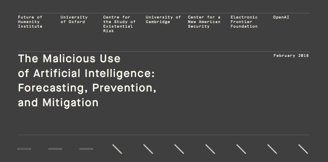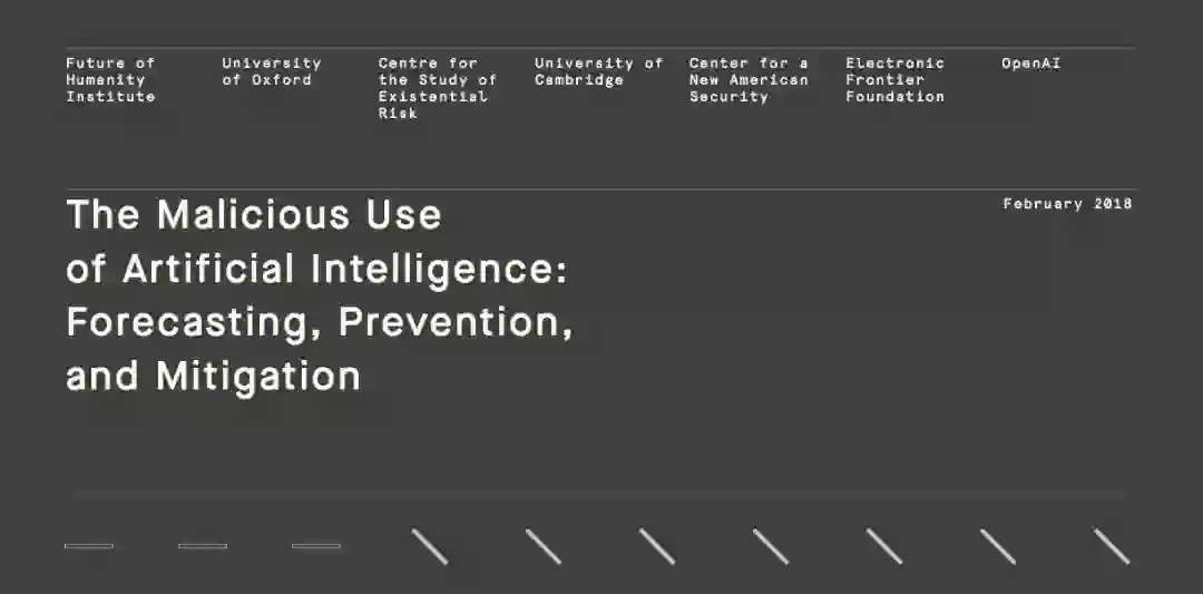 2月20日,26位来自牛津大学、剑桥大学、OpenAI、电子前沿基金会(一个非营利数字版权组织)、新美国安全中心(一家美国智库)等多个研究机构的研究人员发布了一份AI预警报告,针对AI的潜在恶意使用发出警告,并提出相应的预防及缓解措施。