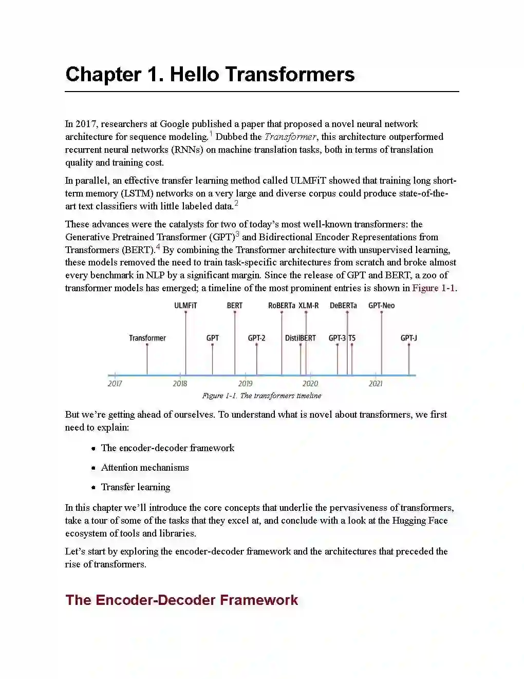 第一章,你好Transformers,介绍了Transformers,并把它们放到了背景中。它还介绍了“Hugging Face”生态系统。