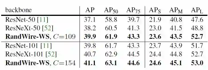 论文将RandWireNN作为骨干网络,用Faster R-CNN with FPN来检测目标(COCO object detection),如表4所示,比ResNet-50和ResNeXt-50效果好。