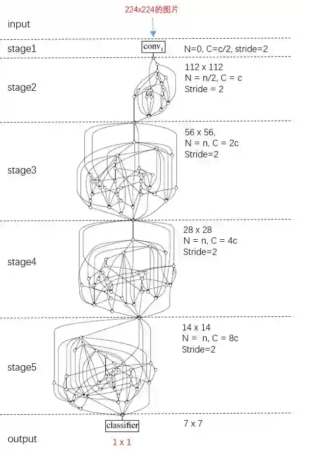 借鉴其他经典深度学习神经网络,作者将多个NN堆叠起来形成最终的随机连接神经网络RandWireNN。图3为一个示例,其包含共5个stages,其中stage1是一个卷积层,stage2可以是一个卷积层或者是一个NN,stage3、stage4和stage5均为NN。不同stage之间:卷积操作的stride为2,故feature map的大小逐渐减半;卷积操作的卷积核的数量x2,故feature map的通道数(即C)也x2。