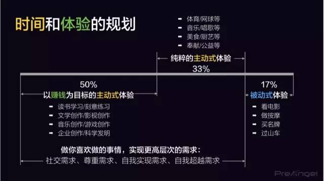 而主动式体验就是需要刻意练习的体验,比如说我要把钢琴从一弹到九级、围棋从初学者下到九段、跆拳道练到黑带、登顶珠峰、把一家企业从零做到上市,这都是不能花钱直接买来的体验,都是主动式体验。