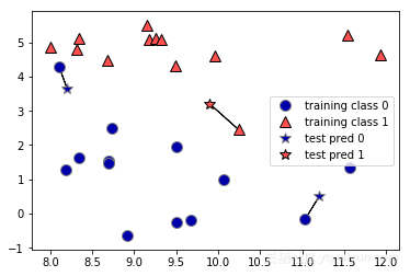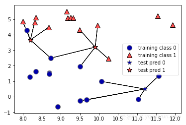 从图中可以看到,我们添加了三个新的数据点,用星星表示。对于三个点中的每一点,我们都标记了训练集中离其最近的点,最近邻算法的预测输出就是标记的这点(用交叉颜色进行表示)。