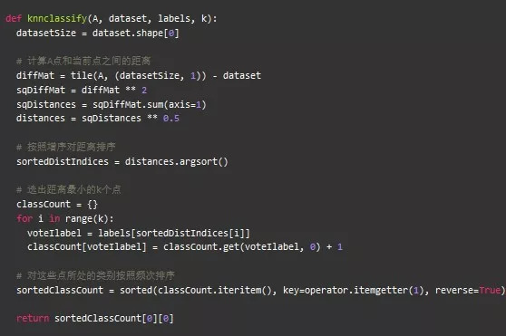 函数knnclassify需要4个输入参数:要分类的输入向量称为A,称为dataSet的训练样例的完整矩阵,称为labels的标签向量,以及k——在投票中使用的最近邻居的数量。