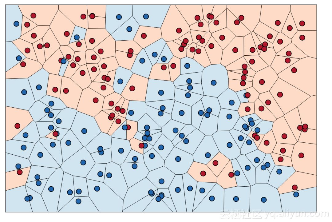 为了对测试数据进行预测,对于测试集中的每个数据点,都要使用该方法计算训练集中的最近邻居,并找到其中最频繁出现的类;