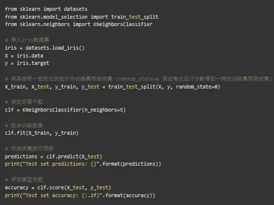 Scikit-Learn是一个机器学习工具箱,内部集成了很多机器学习算法。现在让我们看一下如何使用Scikit-learn实现kNN算法。代码如下: