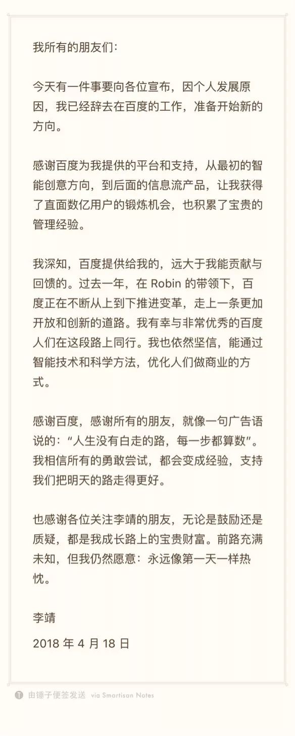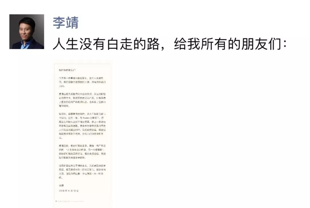 在朋友圈中,李靖称自己在百度收获良多,并对百度的信任和支持表示感谢。他表示,自己选择离开是出于个人原因:
