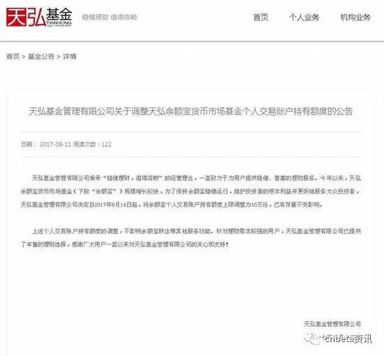 更大的噩耗又来了:天弘基金今天宣布,为了保持余额宝稳健运行,维护用户根本利益,更好滴服务大众投资者,8月14日0点起,个人持有余额宝的最高额度调整为10万元。