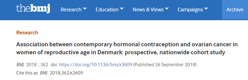 该研究于近日以“Association between contemporary hormonal contraception and ovarian cancer in women of reproductive age in Denmark: prospective, nationwide cohort study”为题发表在知名学术期刊《BMJ》上。