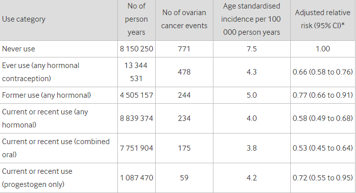 2、Association between contemporary hormonal contraception and ovarian cancer in women of reproductive age in Denmark: prospective, nationwide cohort study
