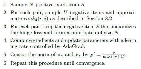 对于每一个user-item 对,并行采样U对negative items,并计算hinge loss