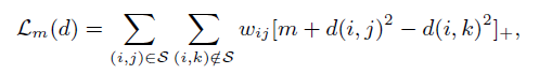 其原理与Weinberger的Metic learning经典文章(large margin nearest neighbor)LMNN[1]的方式非常相似,但本文提到的loss function与LMNN有三点不同: