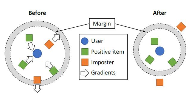 图中含义非常明显:对于User喜欢的物品(Positive item),其渐变向User移动。同时,User不喜欢的物品,在计算的过程中,会逐渐从向外移动,直到被推出外围一个安全的距离(m)。