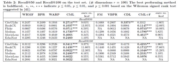 本文提出CML,将Metric Learing与CF结合以提升推荐效果。根据论文中实验结果,在大部分情况下, CML性能提升明显。在实际生产环境中,需要根据具体的场景进行实验,有兴趣的读者可以研究下作者的源码。