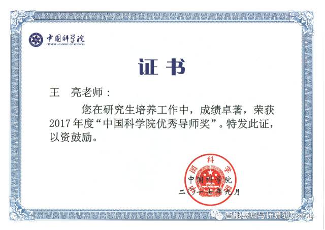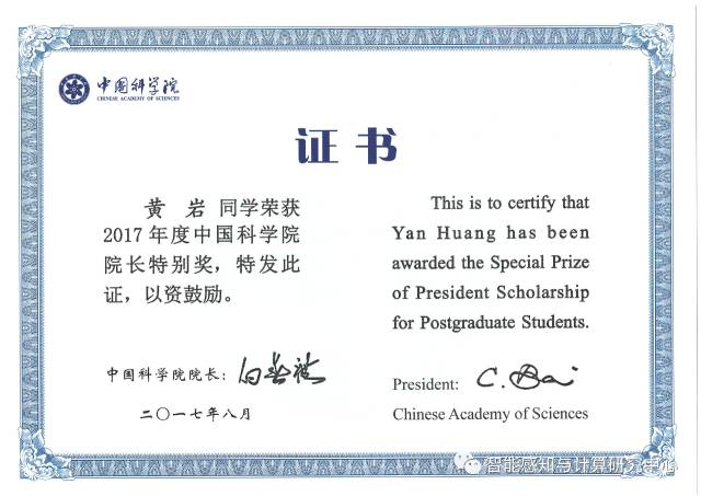 日前,中国科学院大学研究生奖学金、奖教金名单揭晓,自动化所智能感知与计算研究中心黄岩博士、王亮研究员分获2017年度中国科学院院长特别奖、优秀导师奖!