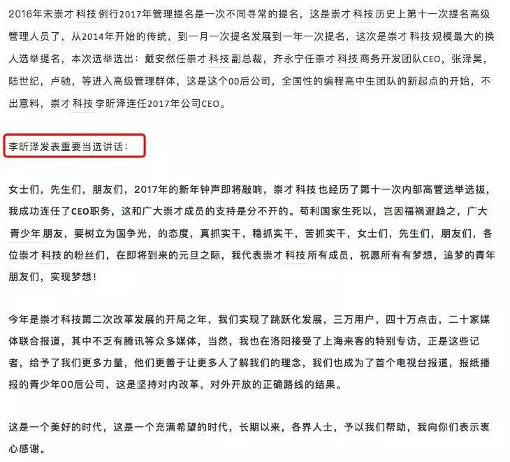 但李昕泽笃信自己的实力。“作为全球第一青少年开发公司,我们不畏艰险 一直拼搏 走到了今天这一步 我们不知道比其他小团队高到哪里去了”,他在微博上表示,“崇才科技 给自己打100分。”