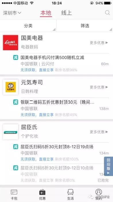 而在优惠一栏下,云闪付分为线上和本地两大类,在本地商户中,可见涵盖了电器类、饮食类等常见商户与银联云闪付展开了合作,返现、折扣、立减等优惠力度不小,并能够通过云闪付统一获得各银行的优惠,无需再一一打开不同的银行APP进行支付。