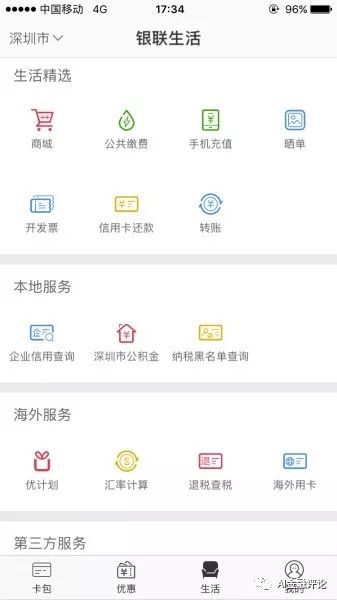 在支付场景上,云闪付APP也在广度和深度上逐渐扩展,极大地丰富了其在各个生活场景的支付应用城程度。在选定生活城市后,于“银联生活"一栏下,AI金融评论发现,云闪付APP共分为生活精选、本地服务、海外服务和第三方服务四大类已有共计近二十个应用场景。