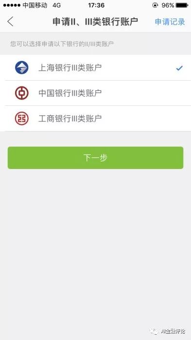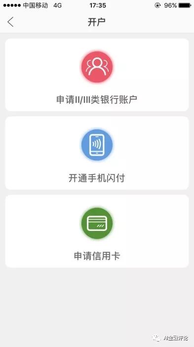 特别需要注意的是,在云闪付APP中,AI金融评论发现其还提供了“开户”功能,在其中用户能够申请Ⅱ、Ⅲ类账户,在移动端即可实现开户和进行应用。并且,AI金融评论绑定的是一张农行卡,在试用过程中发现能够申请上海银行、工商银行和中国银行的Ⅲ类账户,说明作为一款银行业统一APP,云闪付能够让用户在可以没有所申请银行的实体卡的前提下,实现移动端跨行开户。