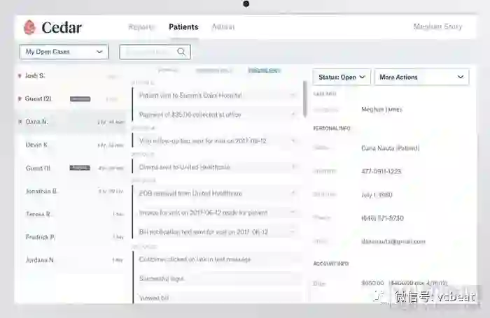 Cedar推出的金融管理平台,通过与医疗机构合作,帮助他们整理患者未支付的账单。当患者支付医疗费用时,可以选择同意从Cedar收到通知,Cedar就代表医疗服务提供商,向患者发送账单。