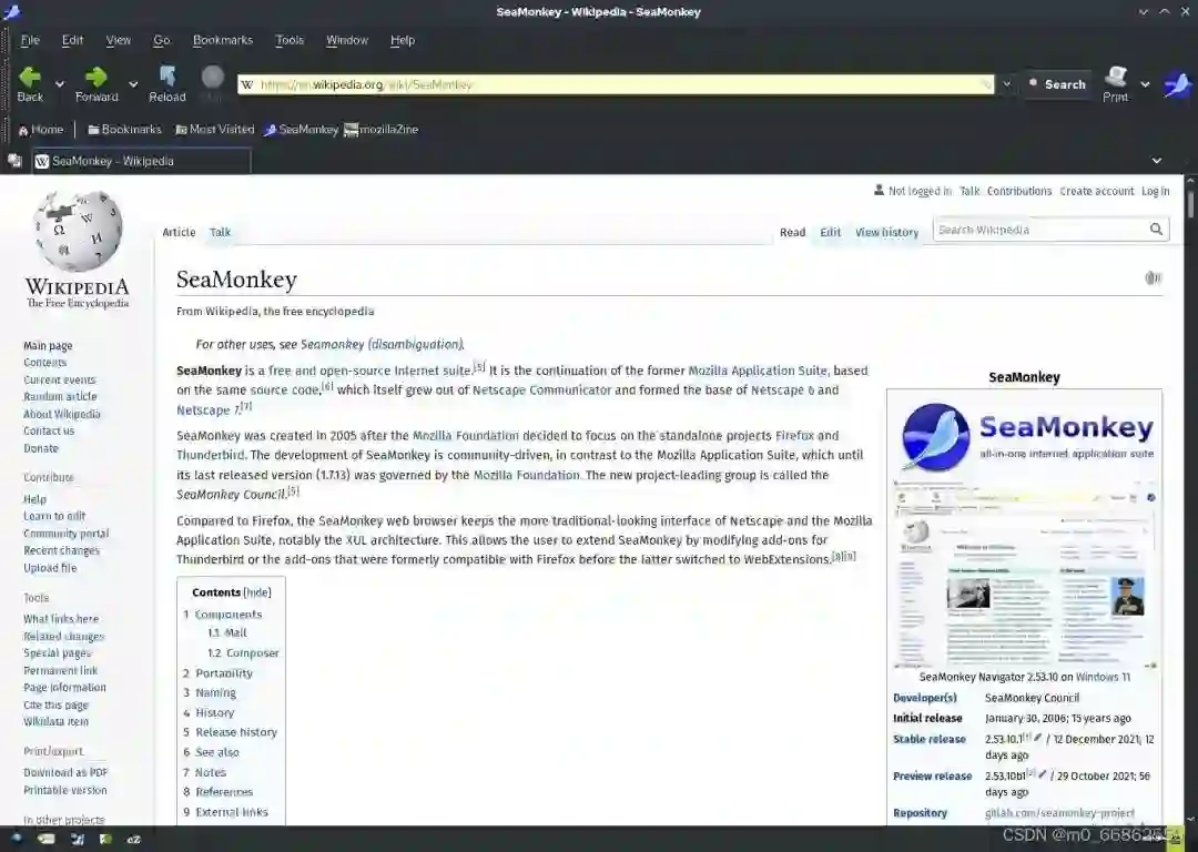 SeaMonkey (海猴)是一个一体化导航器,该浏览器包含了电子邮件客户端、Web 订阅阅读器、HTML 编辑器、IRC 聊天和 Web 开发工具等特性。海猴是一个令人难以置信的 Firefox 分支,就像 Librewolf 一样。正如其网页所说,它使用了大部分相同的 Mozilla Firefox 源代码。