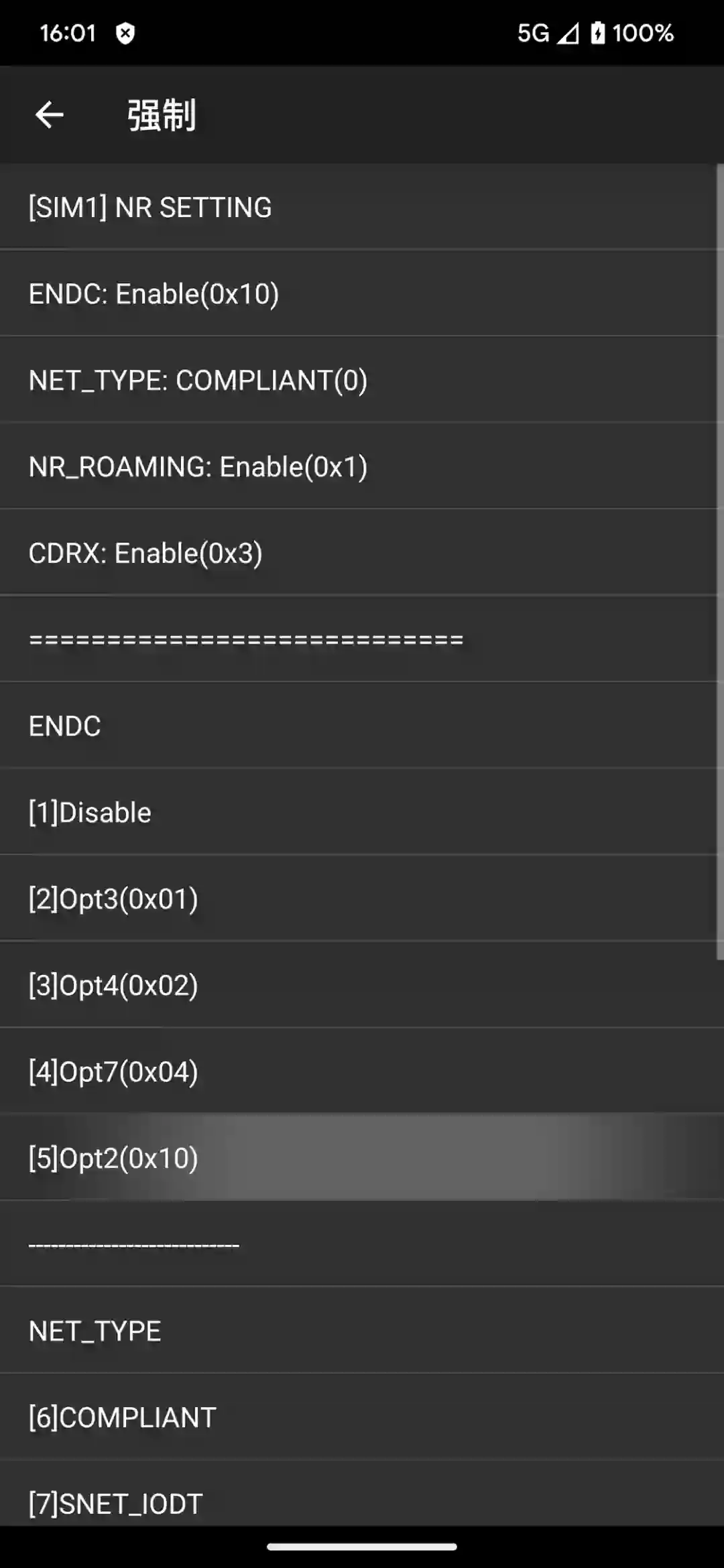 在 NR SETTING 界面找到 ENDC 区域,选择 Opt2 或 Opt3,然后重启手机;