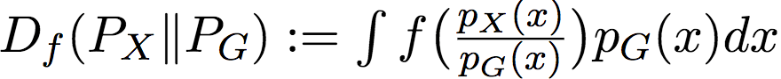 其中,f是满足f(1) = 0的凸函数。f-散度常见的例子有KL散度(Kullback-Leibler divergence)和JS散度(Jenson-Shannon divergence)。