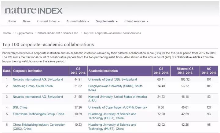 增刊还根据2012至2016年期间的双边合作分值(collaboration score),列出了最具成效的产业-学术合作关系。其中,华大与哥本哈根大学的合作位居全球第四,诺华公司与巴塞尔大学、与哈佛大学的合作分别居于全球第一、三位,三星公司与成均馆大学的合作位居第二。此外,在“全球产业-学术合作量50强企业”榜单中,华大荣登榜首。