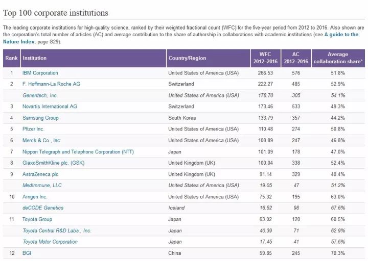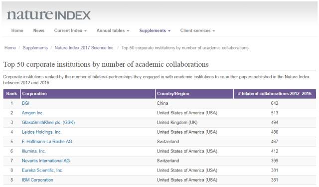 据自然指数2012至2016年期间的数据显示,在指数所追踪的全球企业科研成果中,中国位列第四,次于美国、日本和英国。这五年间,全球高质量科研产出最多的十大企业为:美国IBM公司、瑞士霍夫曼•罗氏公司、瑞士诺华公司、韩国三星公司、辉瑞公司、默克公司、日本电报电话公司(NTT)、英国制药公司葛兰素史克、阿斯利康、美国安进公司(Amgen)。位居全球第十二位的华大成为中国排名最靠前的机构。此外,还有四家中国企业——中国化工集团公司、中国电子科技集团公司、中国船舶重工集团公司和烽火科技集团位列全球100强。