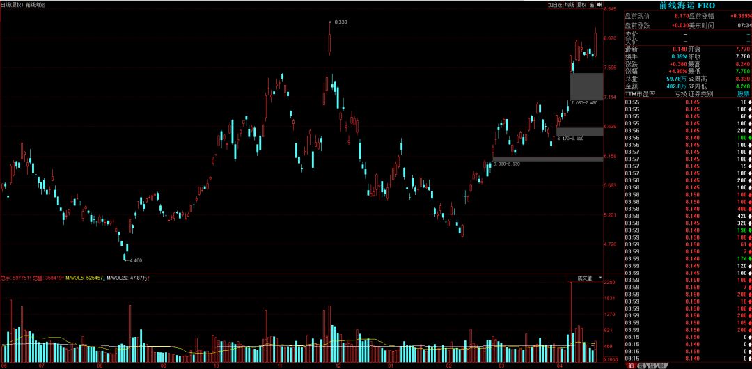 Tip:美股前线海运(代码 FRO)和DHT控股(代码 DHT)的股价走势对于A股标的有所影响,可以比照来看。