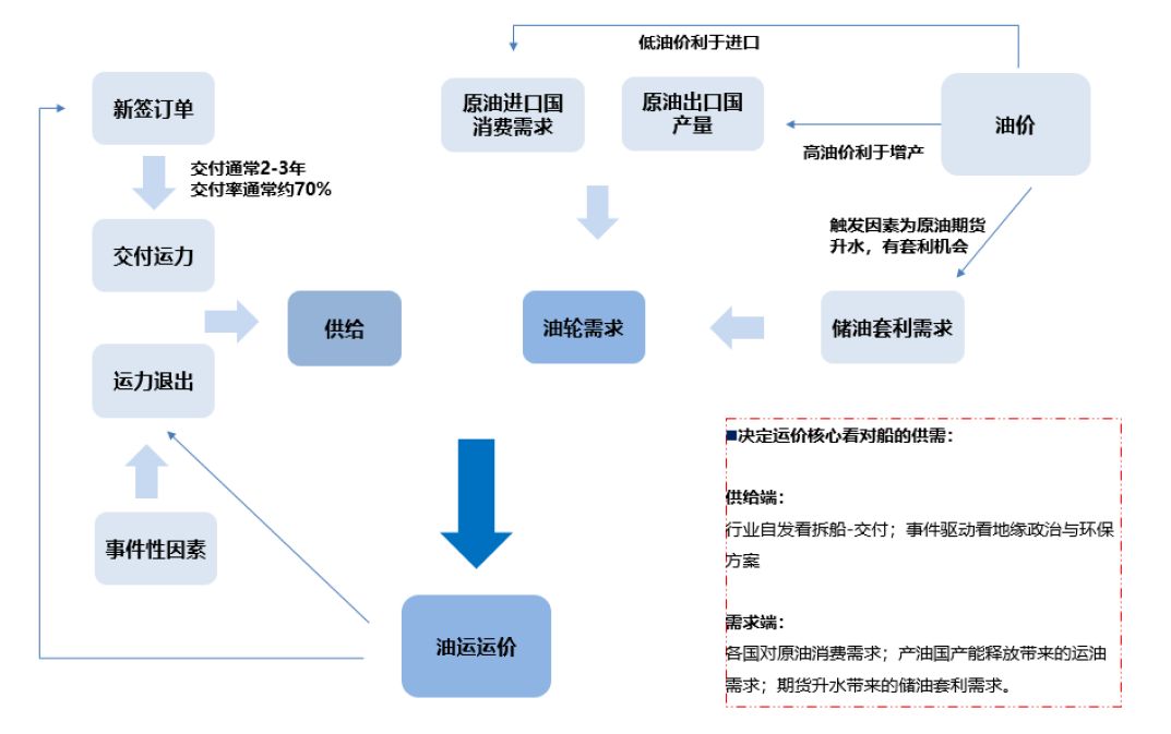VLCC(超大型油轮)供需逻辑图如上,供需共同决定运价,进而决定油运企业的业绩。