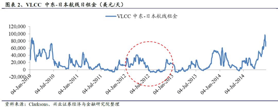 2012年初欧美开始对伊朗石油进行禁运制裁,从结果来看,2012及2013年VLCC日租金的年均值并未产生较大变化,但短期运价有快速攀升。