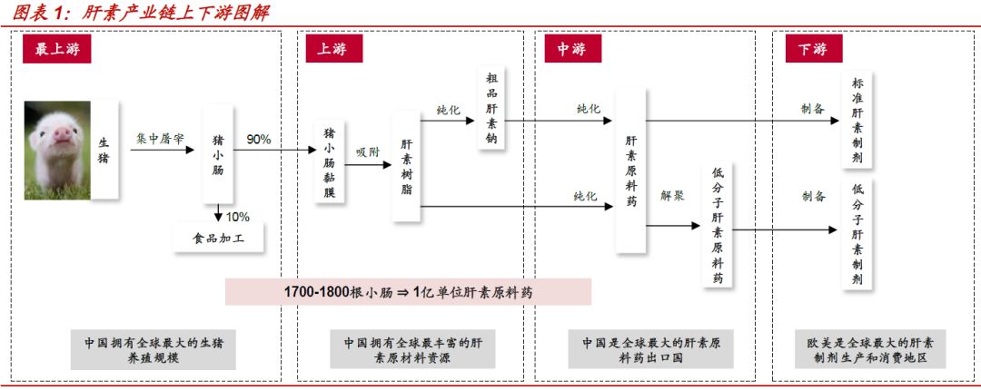 由于结构复杂,肝素无法通过化学合成,只能由猪小肠中获取,产业链最上游为生猪:猪小肠→肝素粗品→肝素原料药→肝素制剂。