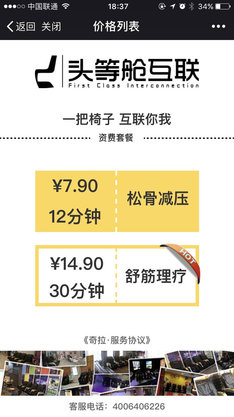 和其他一些共享产品类似,共享按摩椅也是通过在公众号内扫码完成支付,然后享受服务。费用视不同场景,分为5元/6分钟、7.9元/12分钟、14.9元/30分钟等几档。据张鑫透露,目前,每台按摩椅每月营收在1000-1500元之间,而成本主要在于场地租金,从每月几百到一千多不等,回本周期为6-12个月。