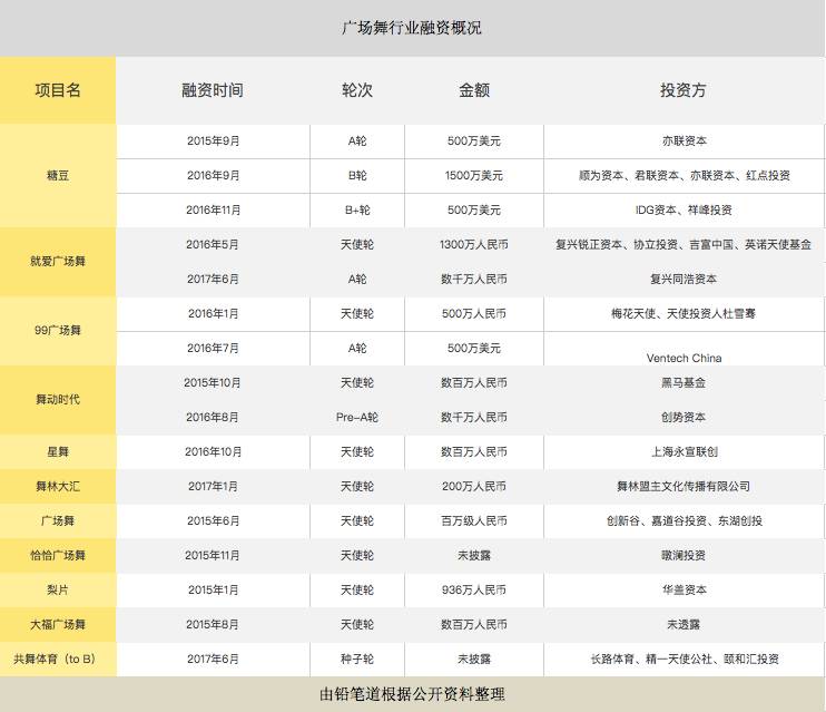 最终,广场舞市场(to C)只留下两种公司:一是以糖豆为代表的纯互利网模式,早期获得巨额融资,用户规模大;二是同时有线下、线下业务,且侧重线下产生交易的模式,如“就爱广场舞”。