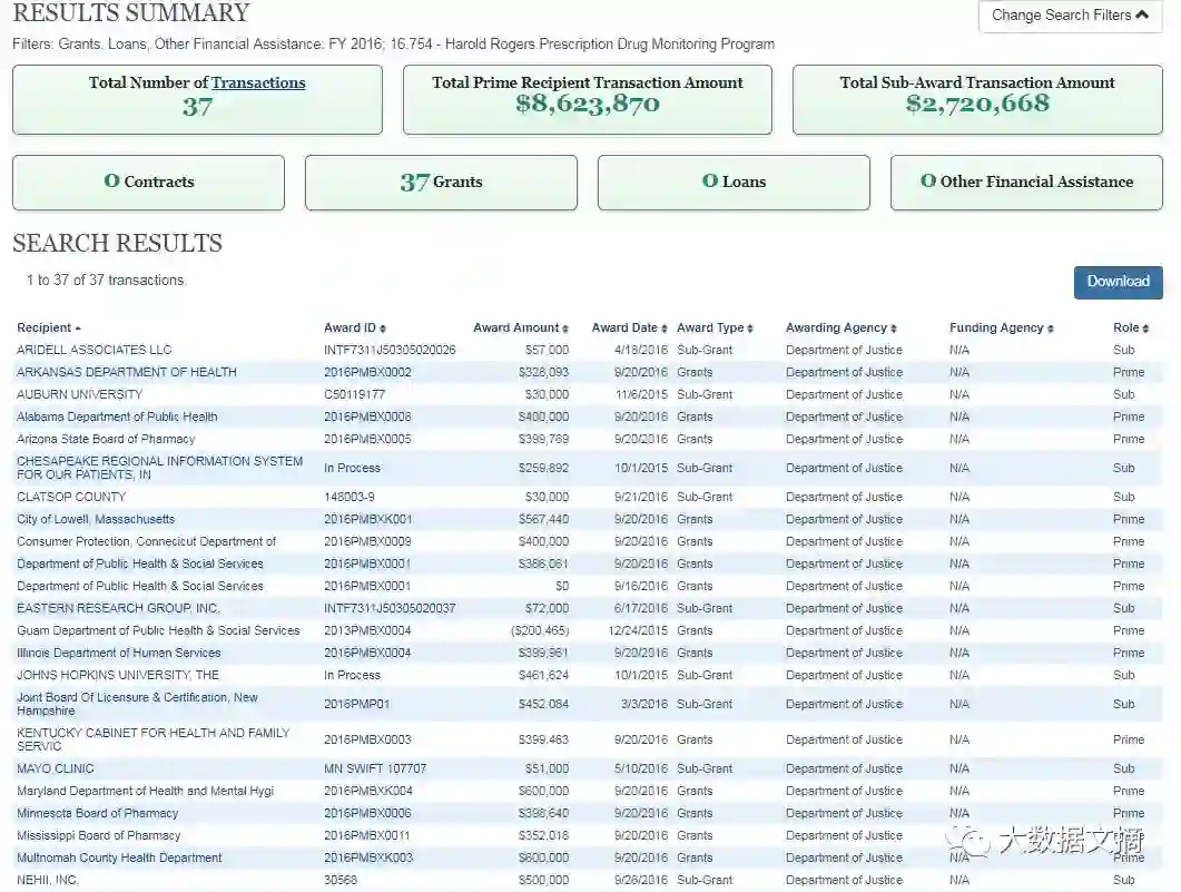 在美国,由于类鸦片类药物滥用而导致的服药过量率上升趋势令人担忧,它影响着全美成千上万的家庭。来自USAspending.gov的最新数据是由经财政部发布在data.world上的,里面包含详细的项目介绍和机构信息,你可以通过它了解联邦政府为解决这一问题所做的工作。