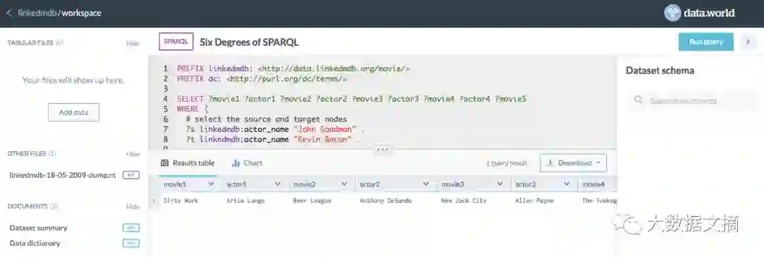 使用SPARQL对这组数据集进行查询再现了著名的“Kevin Bacon的六度空间”理论(“Six Degrees of Kevin Bacon” )——对于数据集中的任意两位演员,通过查询他们以前合作的搭档,你会发现他们之间所间隔的人(如果存在)不会超过六个。