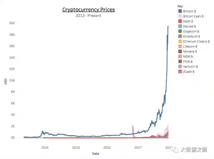 这个项目在IFTTT使用data.world的同步程序,从Coin Metrics(一个提供可视化服务的数据聚合器)提取每日最新数字货币的数据。在此数据集的讨论区中,你可以查看十多种加密货币的价格走势及多种视觉效果图。