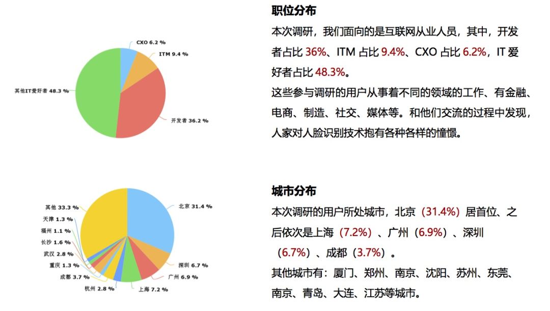 为了帮助大家了解互联网从业人员对人脸识别技术的认知度,进而分析人群比例、城市分布、使用场景等规律,为今后人脸识别功能的用户体验设计优化做基石。