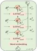 图1(三层rGBN-RNN基于APNEWS(新闻)数据集推断出的主题,以及在主题指导下生成的句子。由上至下,第3层、第2层、第1层主题分别用橙色、黄色和蓝色实线框表示,生成的句子用虚线框表示,虚线框中标注了生成句子所用的主题索引号。图的底部是由不同层次的主题组合生成的句子。