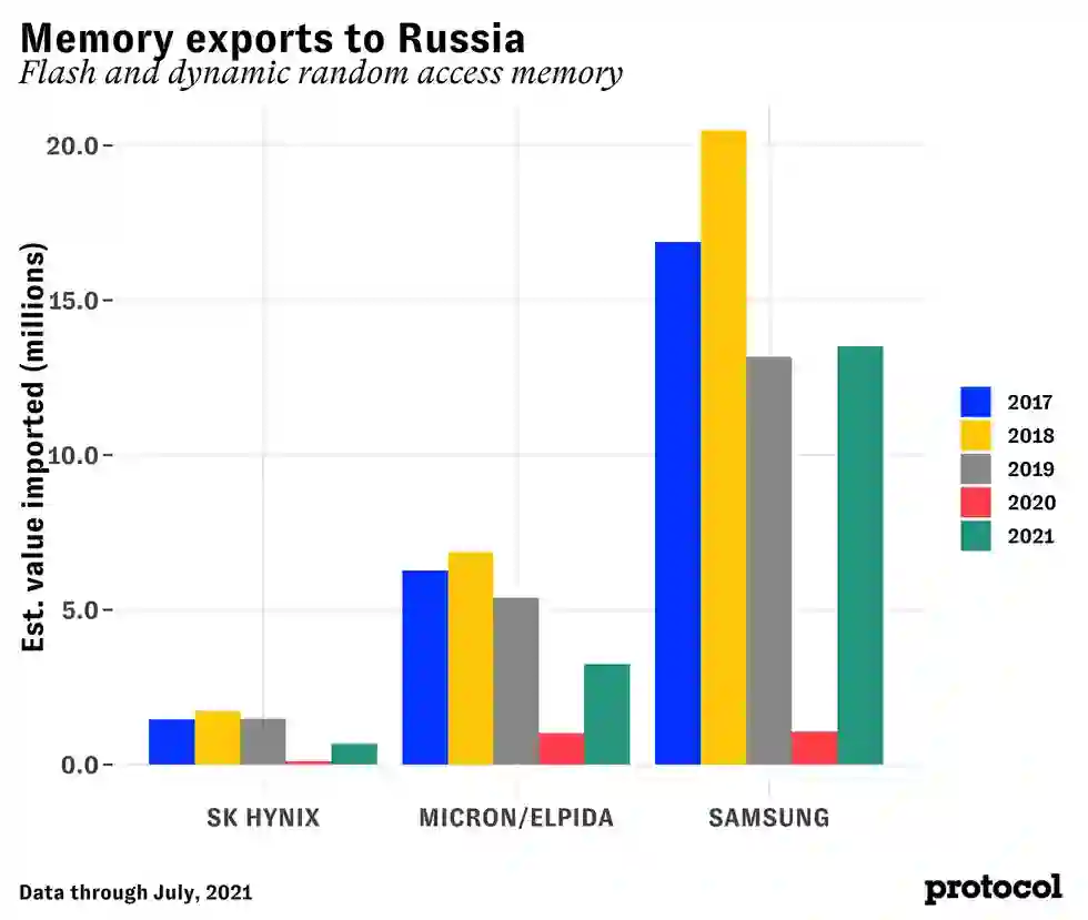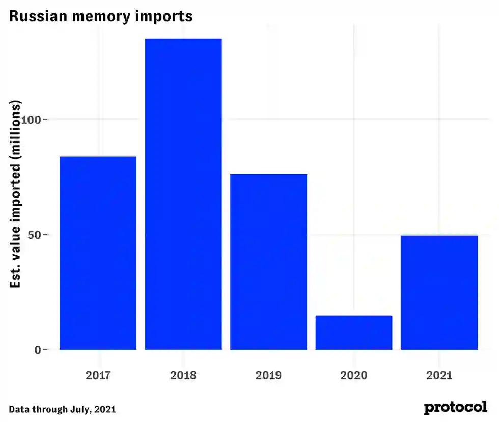 就俄罗斯而言,在2021年的前七个月,它进口了价值约5000万美元的内存芯片。