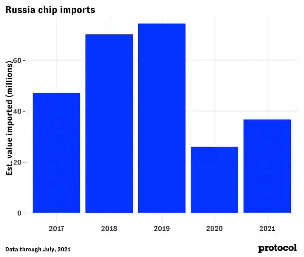 从ImportGenius提供的2017年到2021年7月的146,000条海关记录来看,俄罗斯在2021年上半年大约进口了价值近4000万美元的散装芯片。