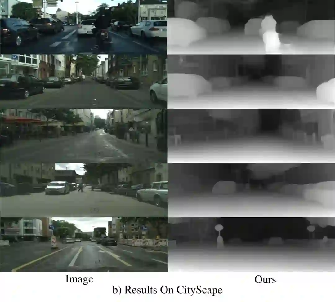 为了验证SVS模型在其他数据集上的泛化能力,本文将在KITTI数据集上训练好的SVS模型直接应用至Cityscape和 Make3D数据集上,结果可视化效果分别展示在图4及图5中。可以看到即使在训练数据集中没有出现过的场景,本文方法仍然可以得到合理准确的深度估计结果,证实了本文方法较为强大的泛化能力。
