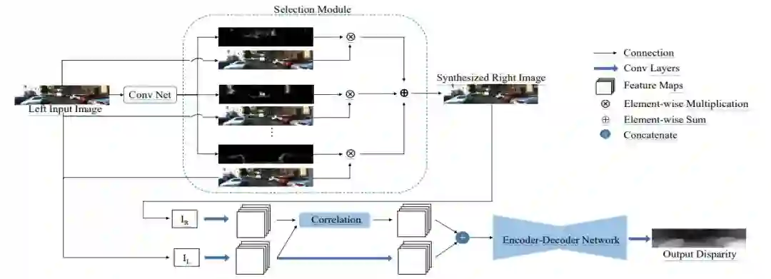 一般情况下,左图中的像素均可以在右图中找到匹配的像素,因此可以首先把左图平移多个不同像素距离,得到多张不同的图片,再使用神经网络预测组合系数,把多张平移后的左图和预测的系数组合得到预测的右图。具体地,视图合成网络基于Deep3D [1] 模型,图2 中的上半部分展示了视图合成网络的示意图。输入一张左图,首先主干网络对其提取不同尺度的特征,再经过上采样层把不同尺度的特征统一至同一个尺寸,然后经过累加操作融合成输出特征并预测出概率视差图,最后经过选择模块(selection module)结合概率视差图以及输入的左图,得到预测的右图。本文采用L1 损失函数训练这个网络。