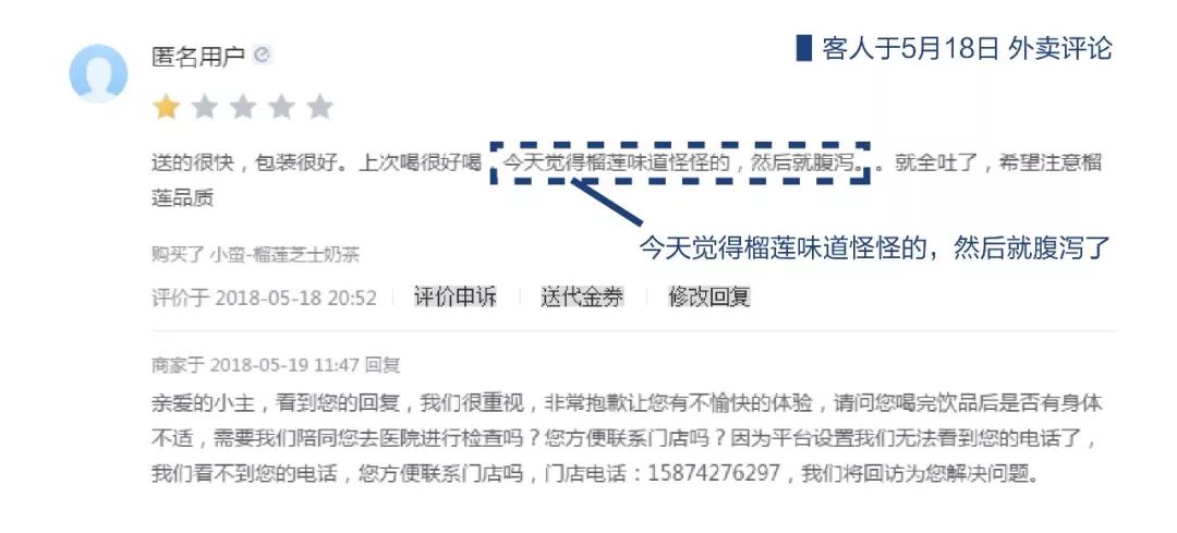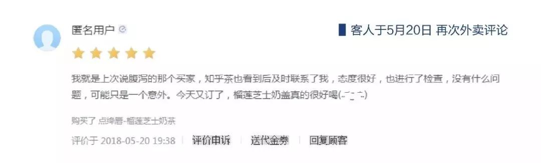 5月18日天马店饿了么21号单,顾客点了一杯小蛮榴莲芝士,在外卖平台评价榴莲味道怪怪的,然后就腹泻,全吐了。情况发生后,门店通过后台联系到顾客进行致歉,询问身体情况有否好转,是否需要陪同前往医院检查。同时调取了18日的监控视频和销售记录,并彻查店内食材:客人在18:40下的订单,18:50出餐,19:10分到达。由于同批榴莲芝士已经用完,所以门店伙伴重新制作了一份榴莲芝士,邀请顾客尝试,食用后均无异常;其中一份再室温下放置了30分钟后尝试,也无异常。