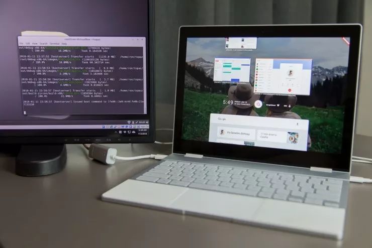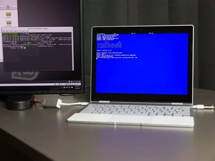 2018 年 1 月,Google 发布了一份文档称,允许开发者在 Pixelbook 上测试 Fuchsia。Ars Technica 成功地在一台 Pixelbook 上在 Fuchsia 进行了测试。从测试的情况来看,安装 Fuchsia OS 的过程比较独特,首先将引导文件放置在 USB 设备中,引导启动后进入 Zedboot 界面,要想进入真正的系统需要保持联网状态,然后下载一个约 1.1 GB 的文件后就开机了——但这依然只是一个针对功能尤其有限的初级产品的测试,看不到任何与现有产品有竞争关系的迹象。