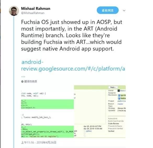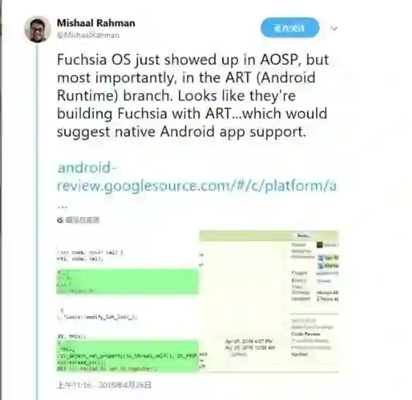 2018 年 4 月,开发者 Mishaal Rahman 发现 Android 源代码项目站点上出现了基于非 Linux 核心的 Fuchsia 源码,于是他认为 Fuchsia 系统极有可能兼容原生的 Android 应用。