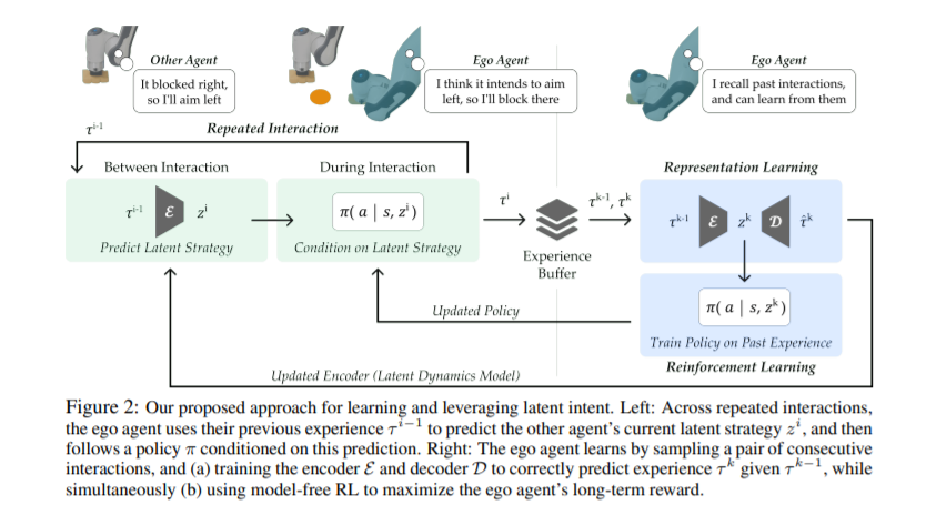智能体与人类或机器人的无缝交互很困难,因为现实环境是动态变化的,并根据自智能体的行为更新策略,而自智能体必须预测这些变化以随机应变。受人类行为启发,我们认识到机器人不需要显式地为另一个智能体要进行的每一个低级动作建模;相反,我们可以通过高级表征来捕捉其他智能体的潜在策略。我们提出了一个基于强化学习的学习框架来学习一个智能体策略的潜在表示,其中自智能体识别其行为与另一个智能体的未来策略之间的关系。然后,自智能体利用这些潜在的动力来影响另一个智能体,有目的地引导他们走向共同适应的策略。在多个模拟领域和一个真实的空中曲棍球游戏中,本文的方法要优于其他方法,并学会了影响其他智能体。
