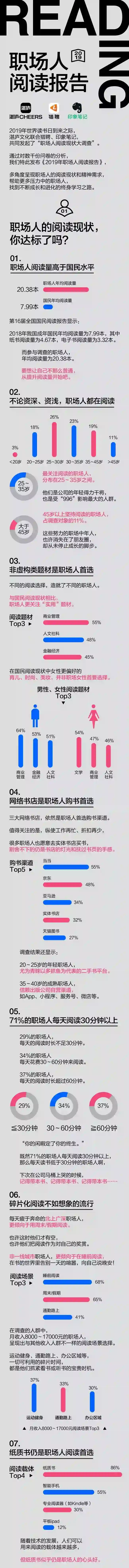 全民阅读报告的数据显示,2018年我国成年国民人均纸书阅读量为4.67本,人均电子书阅读量仅为3.32本,而这次职场人阅读调查显示,职场人年均阅读量超过20.38本。
