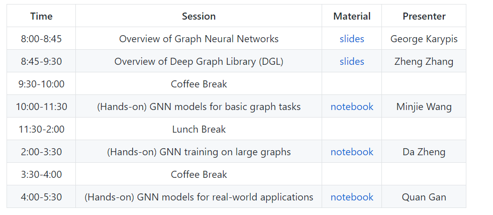 本教程的目标有两个。首先,它将概述GNN背后的理论,讨论GNN非常适合的问题类型,并介绍一些最广泛使用的GNN模型体系结构和设计用来解决的问题/应用程序。其次,它将引入深度图库(Deep Graph Library, DGL),这是一种新的软件框架,简化了高效的基于GNN的训练和推理程序的开发。为了使事情更具体,本教程将提供使用DGL的实践会话。这个实践部分将涵盖基本的图形应用程序(例如,节点分类和链接预测),以及更高级的主题,包括在大型图和分布式设置中训练GNN。此外,它还将提供使用GNNs和DGL进行实际应用(如推荐和欺诈检测)的实践教程。