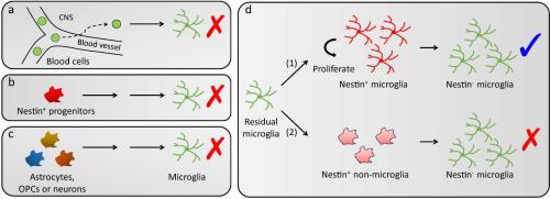 成年哺乳动物中枢神经系统(包括脑、视网膜和脊髓)的再生能力极其有限,曾在相当长的时间内认为中枢神经系统受损将无法修复。2014年,美国加州大学欧文分校研究人员在小鼠脑内发现了细胞再生现象,发现通过特异性抑制集落刺激因子1受体(colony-stimulating factor 1 receptor,CSF1R)的方式可以几乎完全杀死脑内的小胶质细胞(>99%);而当停止抑制并经过短暂恢复期后,脑内出现新生的小胶质细胞。这些再生的小胶质细胞可迅速定殖至全脑,并在一周左右完全恢复至原有状态(如密度、分布和形态)。这是人类首次在成年哺乳动物的中枢神经系统内发现的大规模细胞再生现象,该过程被称为“小胶质细胞再殖”。加州大学该团队通过组织学免疫染色的方式推测,再殖小胶质细胞可能是由脑内的一类瞬时表达Nestin的细胞分化而来。这被认为是继神经干细胞和少突胶质细胞前体细胞之外,在成年哺乳动物中枢神经系统内发现的第三类干细胞。结论一经发表受到广泛关注,同时也带来巨大争议。